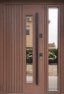 Входная термодверь со стеклом сбоку, металлорейками, длинной ручкой и коричневым покрытием является универсальным вариантом для установки в любых типах зданий. Благодаря высокому качеству сборки дверь не требует сложного ухода и сохраняет презентабельный вид.